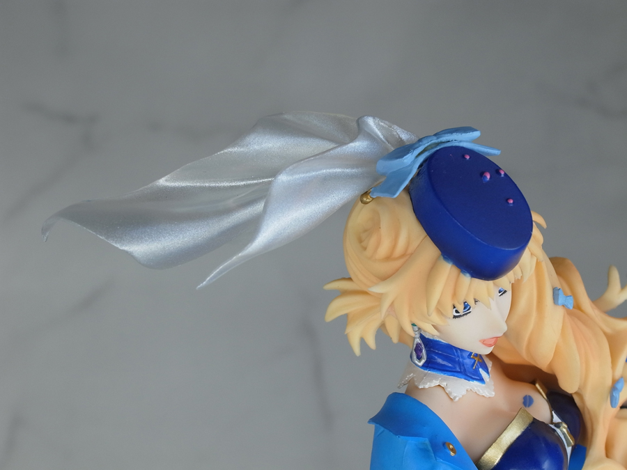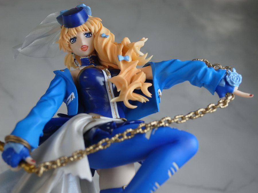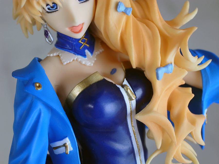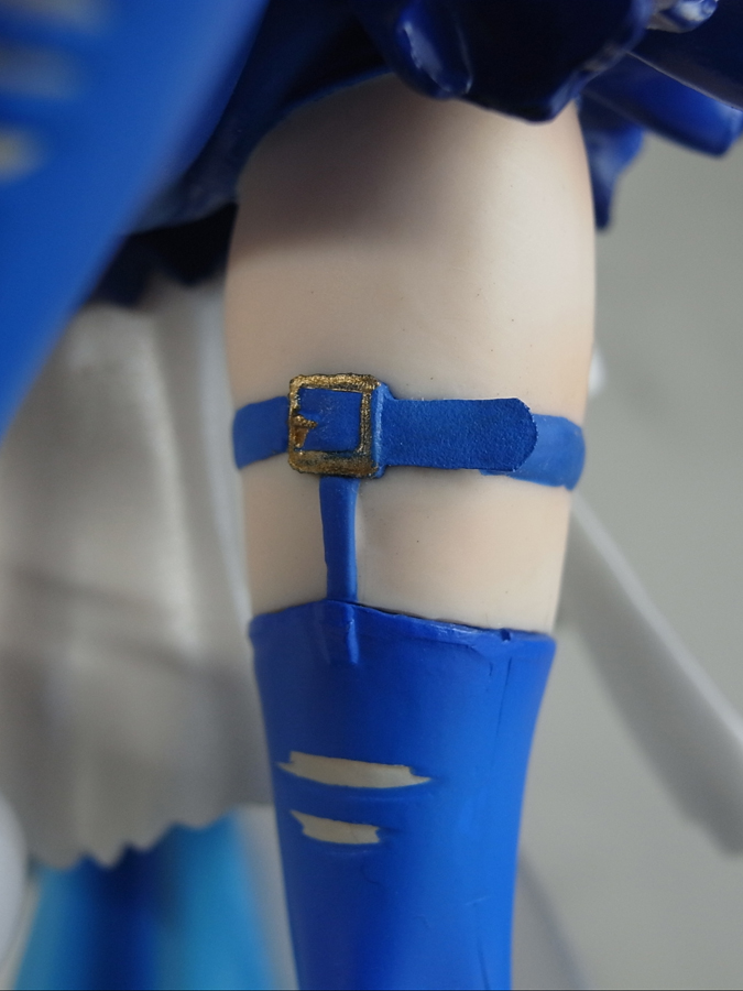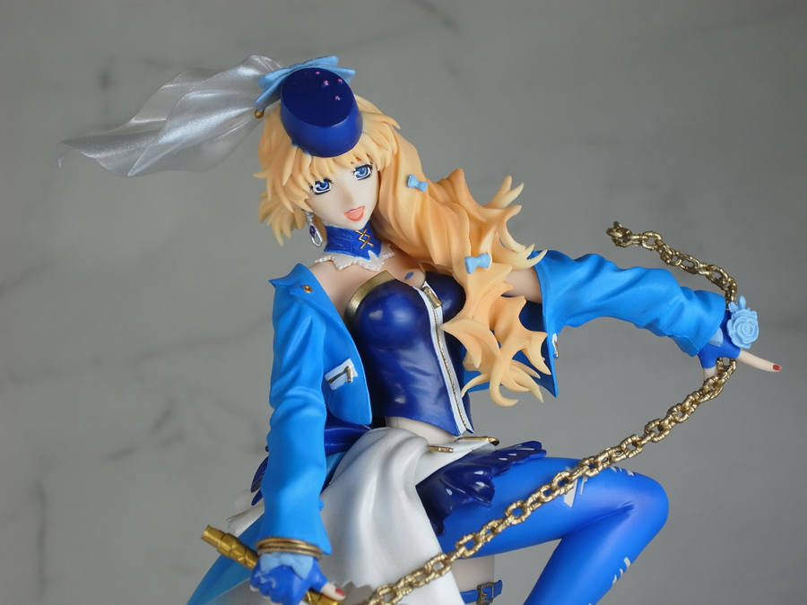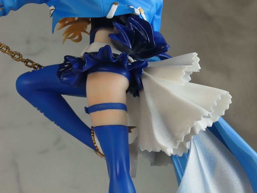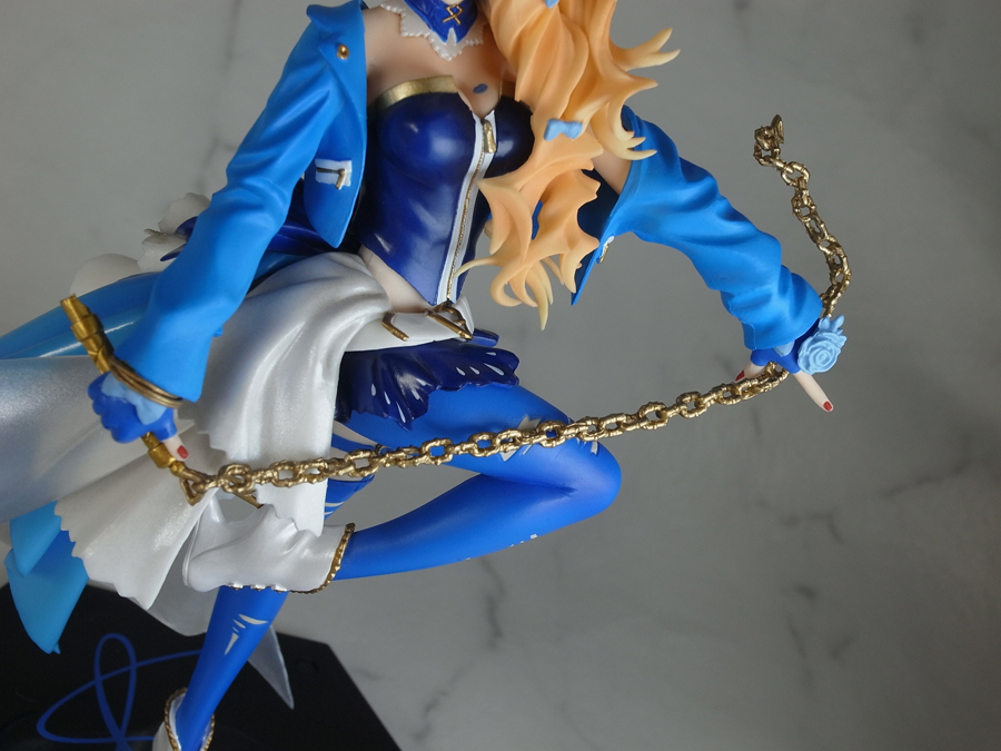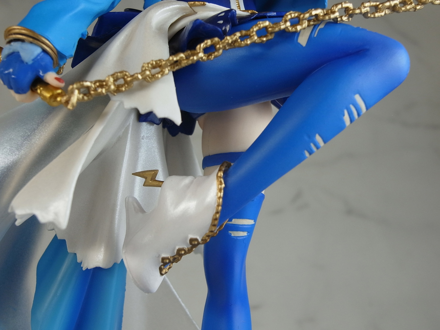 細部パーツの造形、塗装もぬかりない仕上がり。金色のワンポイントが青い衣装の中で引き立っている。