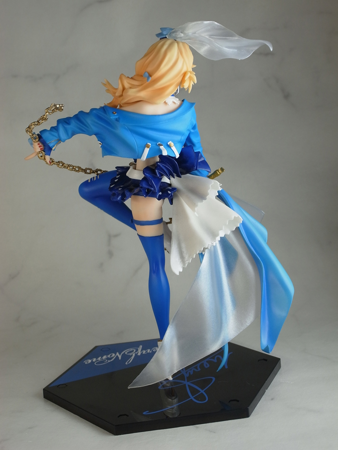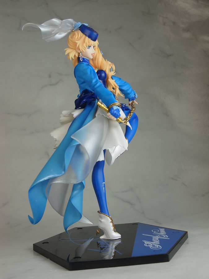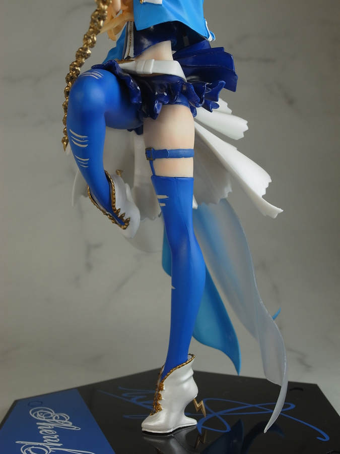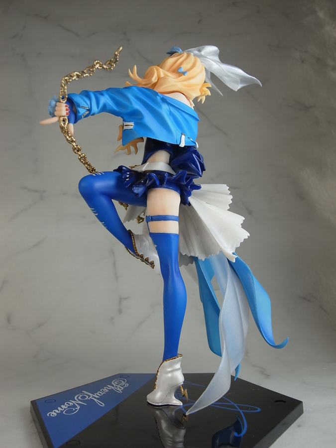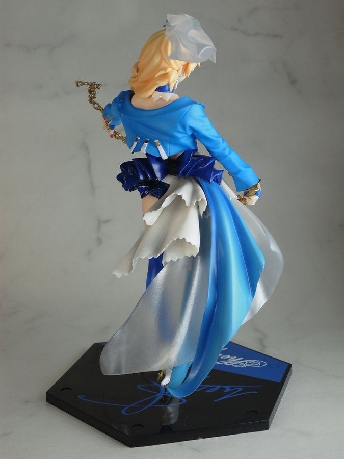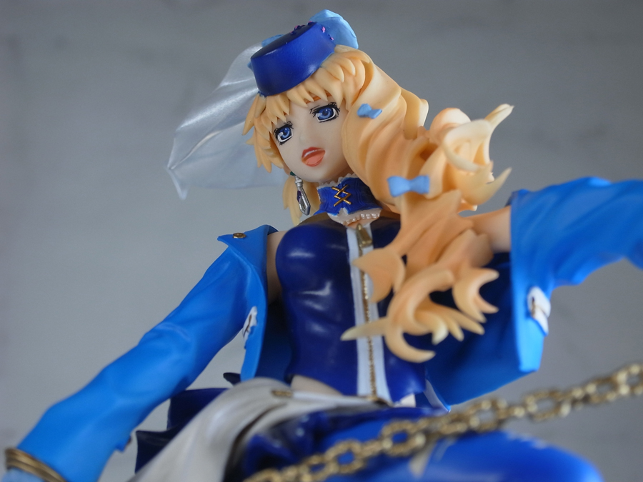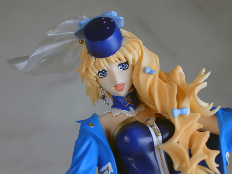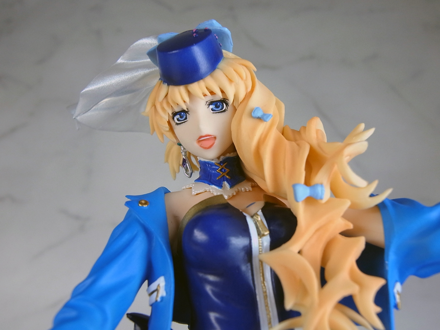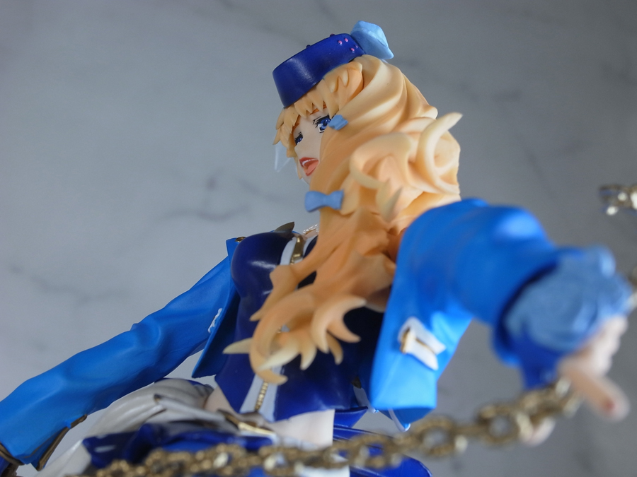 細部パーツの造形、塗装もぬかりない仕上がり。金色のワンポイントが青い衣装の中で引き立っている。