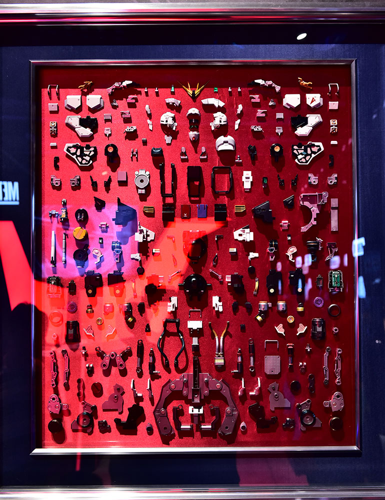 会場に入ってすぐ目に入るのは、今回イベントビジュアルにもメインアイテムとして大きく登場している「FORMANIA EX」のブース。発売中の「FORMANIA EX νガンダム」と9月発売の「FORMANIA EX サザビー」の設計図を積層アクリルパネルで立体的に見せる展示や、「FORMANIA EX νガンダム」を構成する全てのパーツの分解展示など、様々な側面から「FORMANIA EX」のメカニカルな魅力を表現しました。