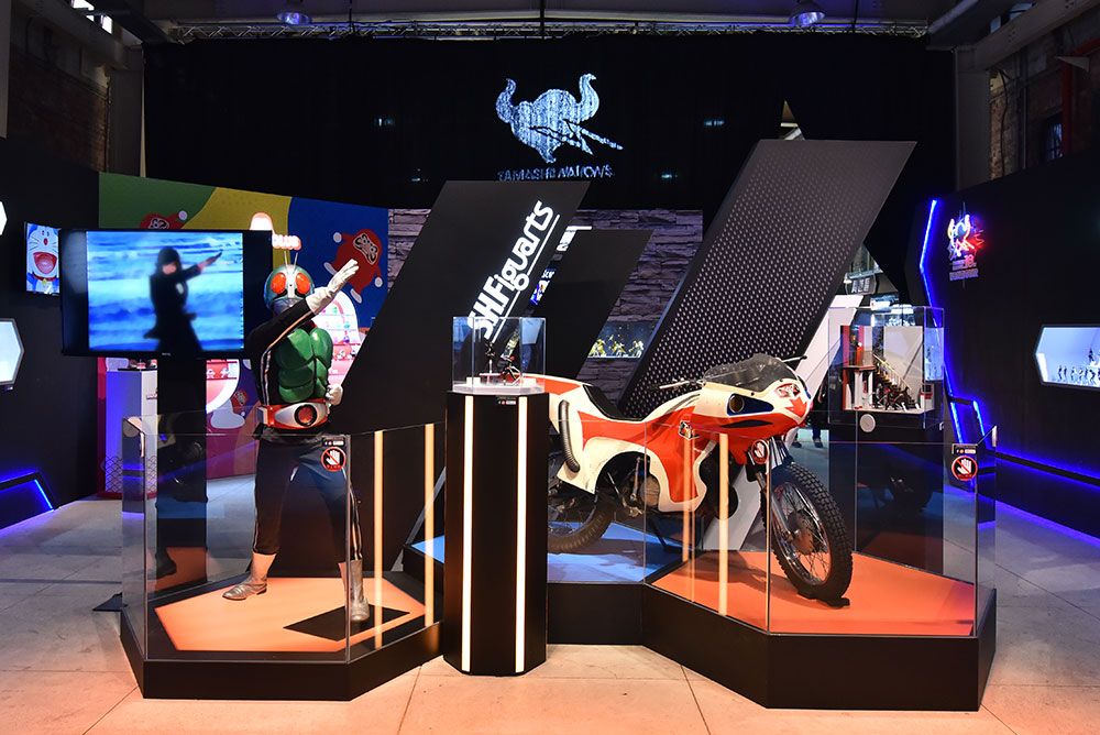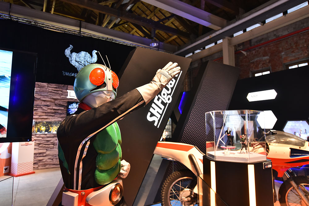 「S.H.Figuarts 仮面ライダー」ブースでは、仮面ライダー新1号の立像とサイクロン号の実車がお出迎え!迫力の実物展示と合わせ、「S.H.Figuarts(真骨彫製法) 仮面ライダー新1号」、そして「S.H.Figuarts 本郷猛」が展示されました。