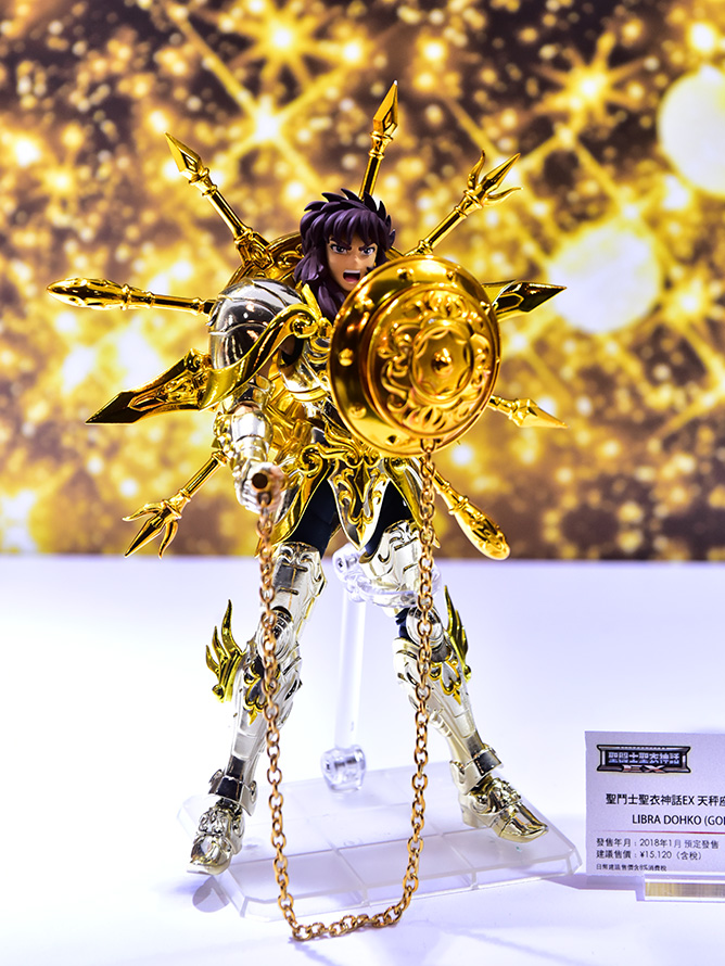 シリーズ最後の1体である「聖闘士聖衣神話EX ライブラ童虎(神聖衣)」に付属する12の武器を、黄金聖闘士がそれぞれ装備する形で展示されました。