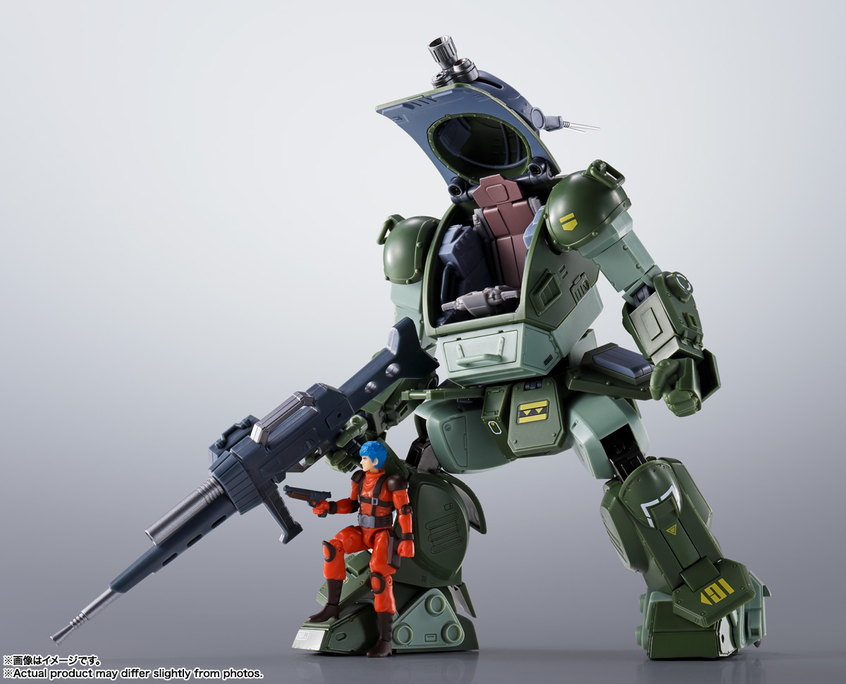 降着ポーズ、パイロットの搭乗、そして戦闘中のアクションを楽しめる完成品「スコープドッグ」としての魅力はそのままに、ダイキャスト関節部により、金属感を強調したメッキを採用するなど新たな装いで登場。