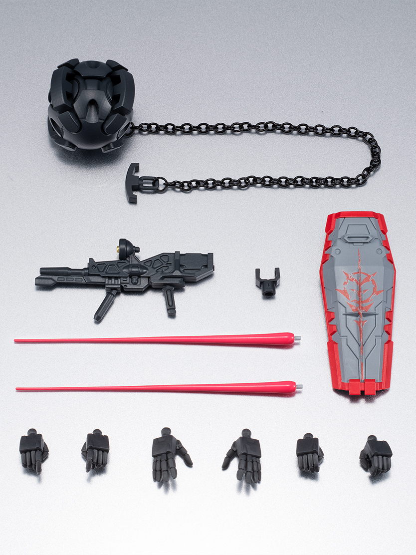 シールドとハンマーが付属。ハンマーの鎖部分には金属パーツを使用。自由に表情をつけることが可能に。