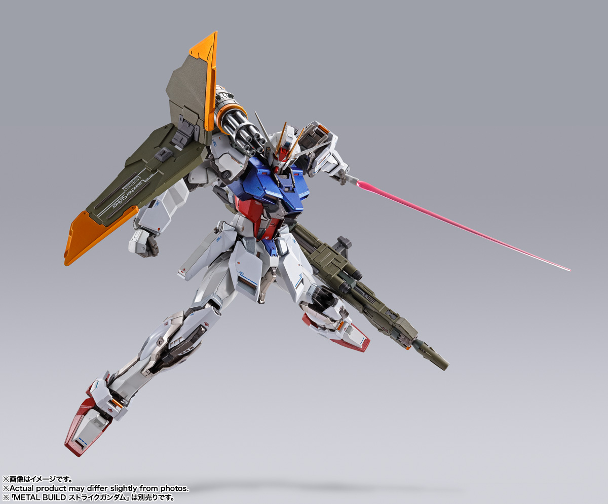 メイン武装「アグニ」は、砲身展開ギミックにより砲撃時をイメージした迫力のボリュームに拡大。肩のコンボウェポンポッドには、クルーズミサイルやビームサーベルを搭載。シールド部を再構成して腕部に装備する事もでき、多彩な武装形態を展開できる。別売りの「ソードストライカー」「エールストライカー」の懸架に対応したスタンドパーツで「ストライクガンダム」とのディスプレイが可能。また2本のランチャーを装備した形態など様々なバリエーションを楽しむことができる。「METAL BUILD ストライクガンダム」シリーズ(別売り)への装着は勿論、「METAL BUILD ガンダムアストレイ」シリーズ(別売り)にも装着可能。