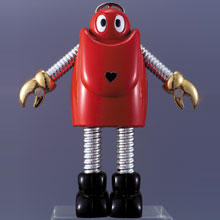 女性にも人気の高いかわいらしいフォルムのロボコン。胸ハッチ開閉ギミック付。パーツの取替えで走行形態に変形。(オリジナルは1974年に発売されました)
