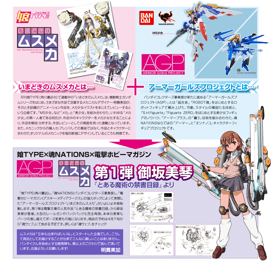 [ アーマーガールズプロジェクト ] 「超合金」「ROBOT魂」をはじめとするロボットフィギュアで積み上げた、可動、スタイルの確固たる技術と、「S.H.Figuarts」「Figuarts ZERO」 をはじめとする美少女フィギュアのノウハウ、「アーマープラス」の「纏う」技術を組み合わせた、TAMASHII NATIONSならではの「アーマー」と「オンナノコ」キャラクターフィギュアプロジェクトです 。