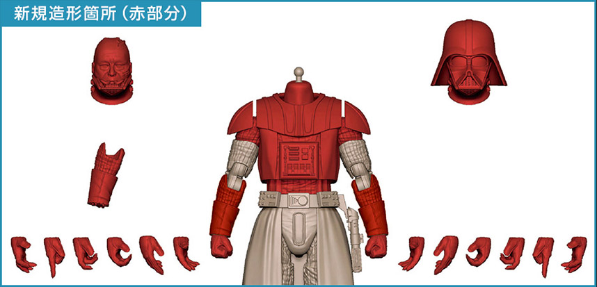 上半身は、胴体・肩・頭部を中心に新規造形。胸部パネルをはじめ、肩周りの彩色・造形を中心に『STAR WARS: Return of the Jedi』のデザインにリニューアル。
