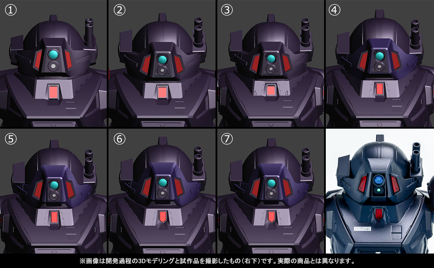 ▲様々な試行錯誤がなされた頭部設計。ここで挙げた「データ上での印象」だけでなく、立体に出力しての「肉眼で見た印象」を確認も行われている(1→7の順に推敲)