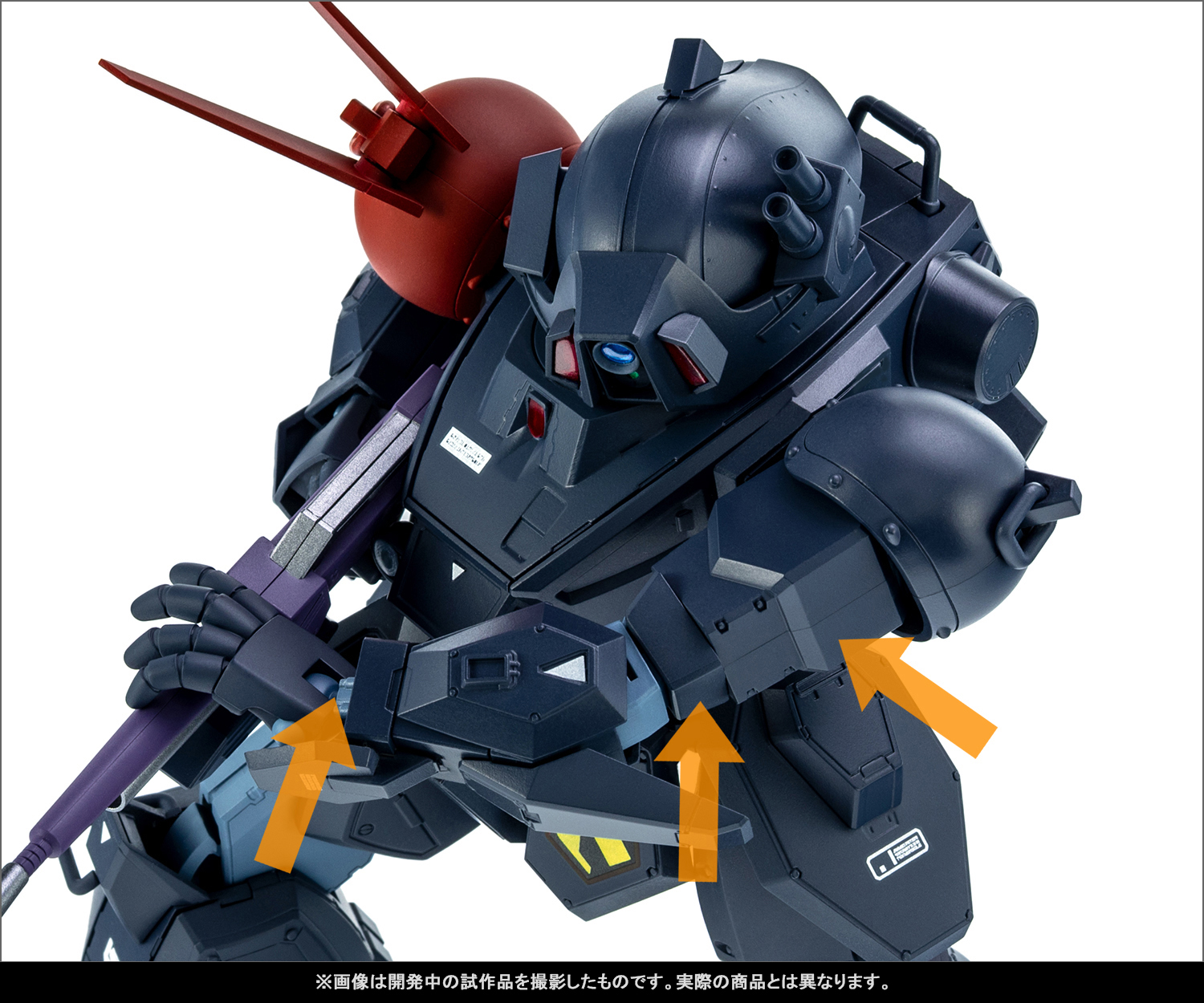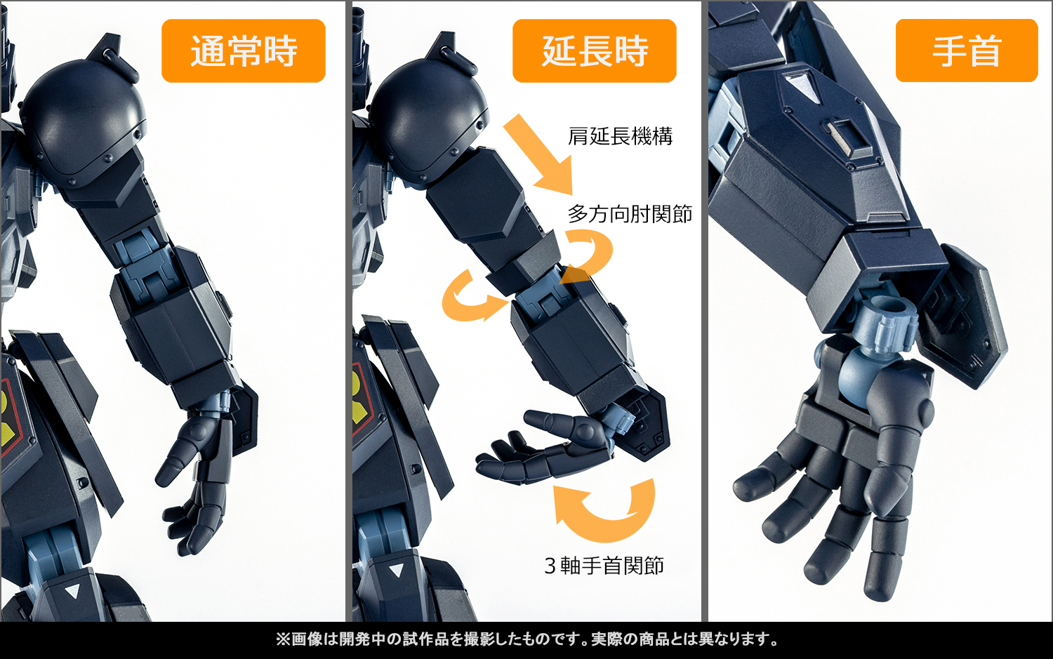 柳沢:今後の発展性を鑑み、ブラッドサッカーにもスコープドッグ レッドショルダーカスタムにて採用された「肩延長機構」「多方向肘関節」 「3軸手首関節」(下画像参照)を搭載。造形、シルエットが異なるブラッドサッカーながらスコープドッグで実現した「自然な銃器の両手持ち」 アクションができる可動域を持っています。